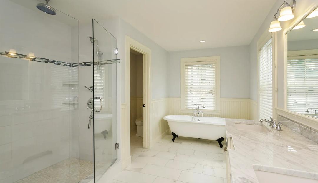 In die Nische eingebaute Dusche mit Glasschiebetür und Fliesenspiegel aus Mosaikfliesen. Freistehende Badewanne und hochwertige Badmöbel mit Einsatzwaschbecken.